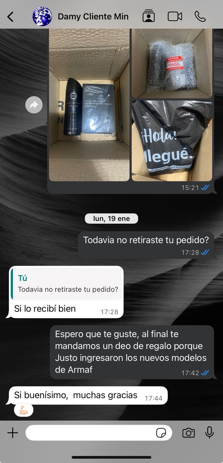Estamos empezando a subir testimonios de nuestros clientes porque nos dimos cuenta que es necesario para generar mas confianza asi que vamos a ir subiendo captura de nuestros clientes que van recibiendo pedidos, tambien aprovechamos a contarles que tenemos casi 200 seguidores en nuestro primer canal de revendedores en wp y mas de 150 seguidores tambien en facebook donde tenemos publicados y actualizamos todos los dias catalogos con nuestro stock disponible y nuevos ingresos.